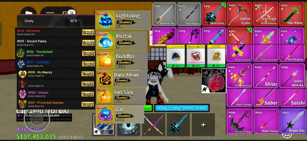 ACC CÓ GOD HUMAN + SONG KIẾM + SOUL GUITAR + MELEE SANGUINE ART + 30M BOUTY + ( GP YORU V2 + GP X2 TIỀN + GP X2 DROP + GP THUYỀN NHANH ) + ( GAS VV + PORTAL VV + LIGHTNING VV + BUDDHA V2 VV + DUNG NHAM V2 VV + ÁNH SÁNG V2 VV ) + ( TỘC RỒNG V4 FULL GEAR VÀ 6 TỘC V4 FULL GEAR ) ACC 100% NHƯ MÔ TẢ